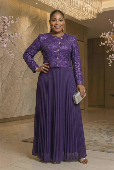 Make a striking statement with this opulent two-piece ensemble, crafted for women who exude confidence and sophistication. The shimmering, sequined jacket adds a touch of luxury and sparkle, perfectly paired with a flowing, pleated maxi dress that offers timeless elegance. Designed from premium fabrics, this set combines radiant glamour with exceptional comfort, making it ideal for high-profile events, soirées, or special occasions.